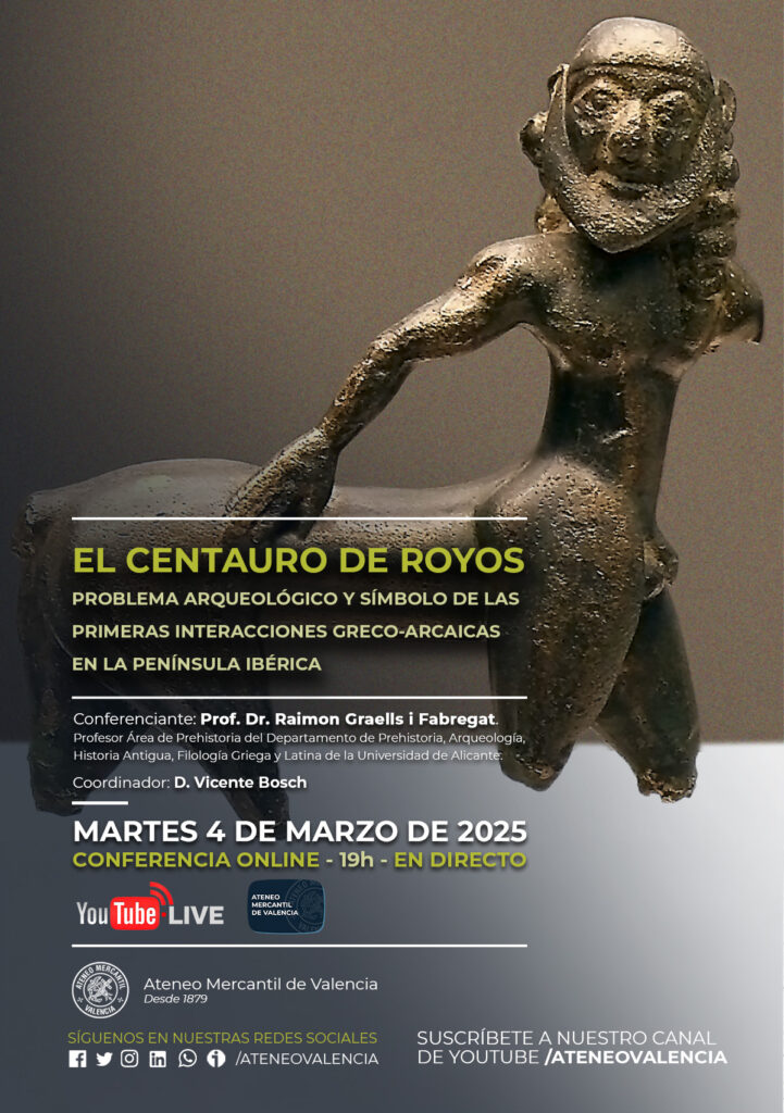 El Ateneo Mercantil de Valencia tiene el placer de invitarte a la fascinante conferencia "El Centauro de Royos. Problema Arqueológico y símbolo de las primeras interacciones greco-arcaicas en la Península Ibérica" que se emitirá en directo de manera Online en el Canal de YouTube del Ateneo. El evento contará con la participación del Prof. Dr. Raimon Graells i Fabregat, reconocido académico del Área de Prehistoria del Departamento de Prehistoria, Arqueología, Historia Antigua, Filología Griega y Latina de la Universidad de Alicante.