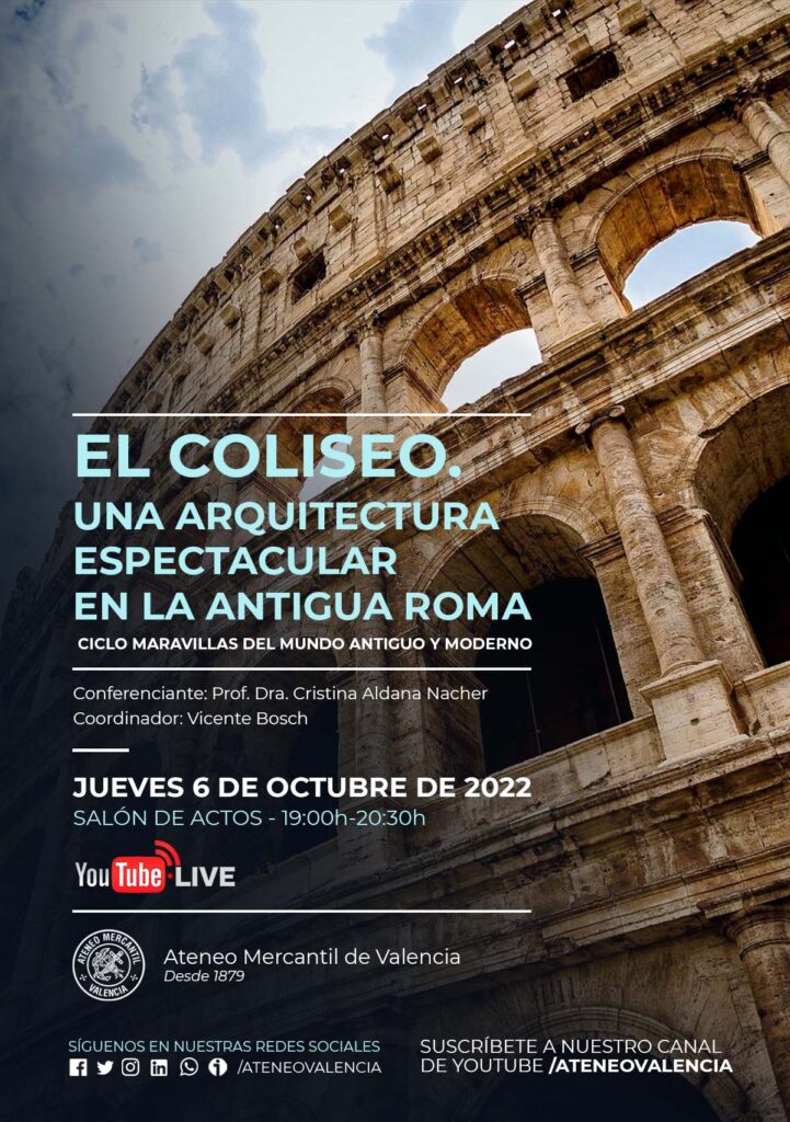La conferencia llega el próximo jueves 6 de octubre a las 19 horas en el Salón de Actos bajo el título "El Coliseo. Una arquitectura espectacular en la Antigua Roma" y la ponente es la Prof. Dra. Cristina Aldana Nacher. Profesora Titular de Hª del Arte Antiguo (desde 1993) en el Departamento de Hª del Arte de la Universitat de València y Doctora en Historia por la Universitat de València (1986). Académica Correspondiente de la Real de Bellas Artes de San Carlos de Valencia (1984) y Secretaria de la Facultat de Geografia i Història de la Universitat de València (de 1999 a 2002). Coordina el acto, Vicente Boch.