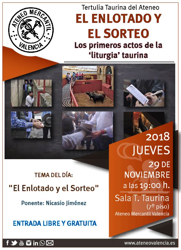 Este jueves 29 de noviembre se vuelve a reunir la Tertulia Taurina para hablar durante dos horas del mundo de los toros. En esta ocasión será Nicasio Jiménez el que traerá hasta el séptimo piso la historia de 'El Enlotado y el Sorteo' antes de una corrida. estos son los primeros actos de la 'liturgia' taurina, un ritual que comienza al mediodía, se reúnen en los corrales de la plaza los protagonistas del festejo junto con la autoridad, encarnada por un delegado gubernativo, para invocar a la suerte.