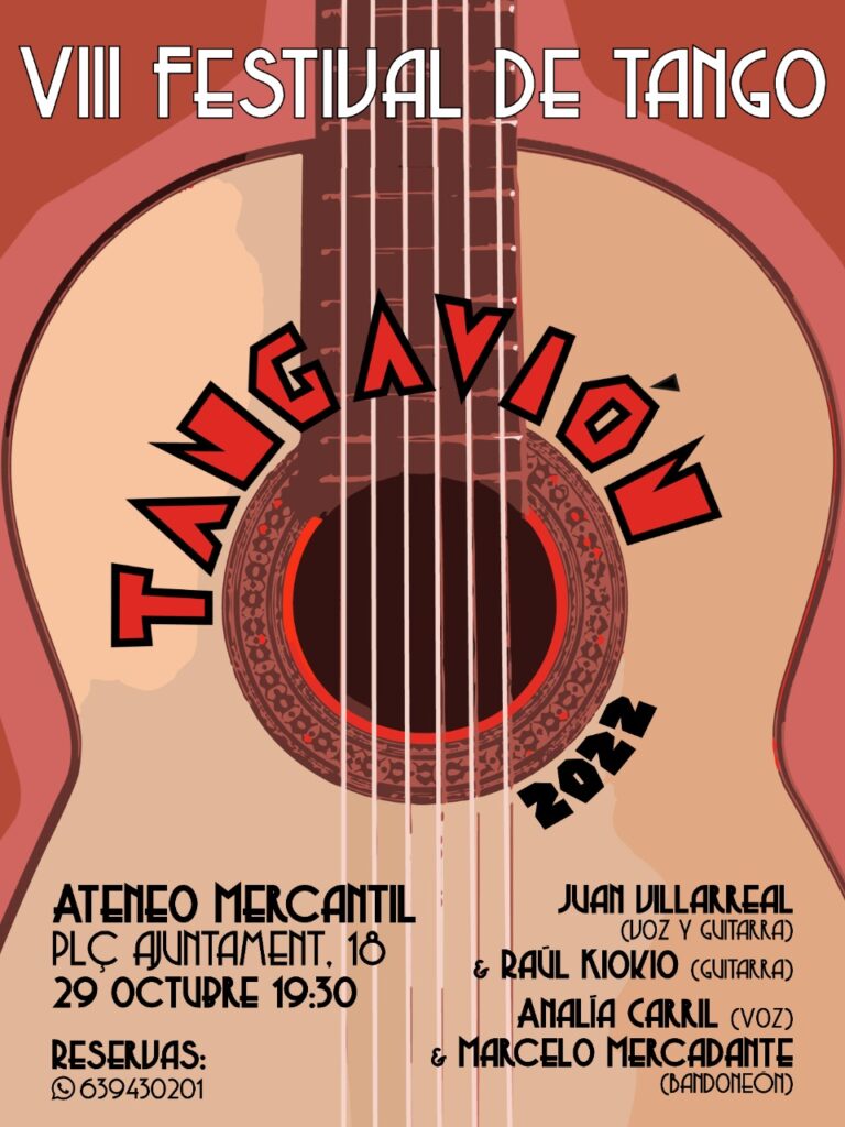El próximo sábado 29 de octubre a las 19.30 horas llega al Salón Sorolla del Ateneo Mercantil de Valencia el TANGAVIÓN 2022, un Festival de Tango creado en Valencia, que cumple su octava edición y para su celebración nos trae un cartel de artistas de primerísimo nivel: Las voces de Juan Villarreal y Analía Carril, la guitarra de Raúl Kiokio y el bandoneón de Marcelo Mercadante nos harán amar aún más a esta hermosa música.