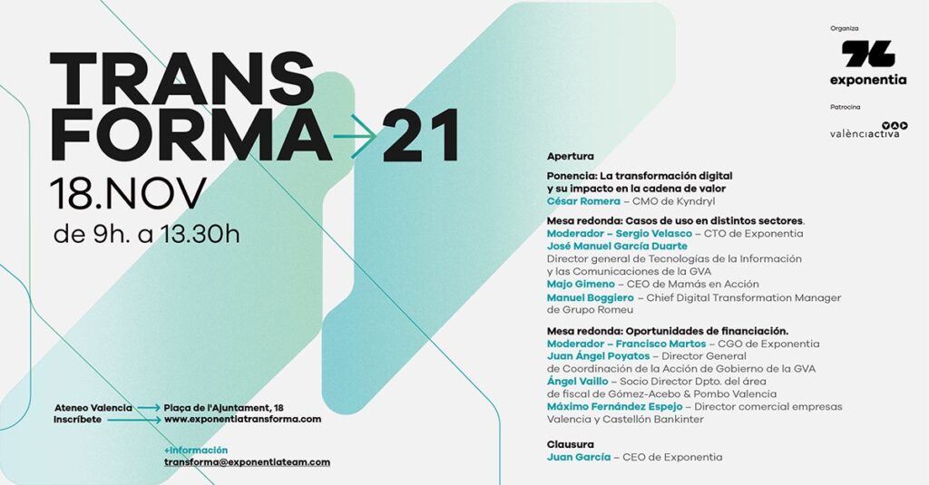 ¿Puede la inteligencia artificial impulsar los sectores tradicionales? ¿Cómo ha aplicado el transporte marítimo la tecnología Blockchain? ¿Cuántas empresas valencianas podrían beneficiarse de la financiación europea destinada a transformación digital? Para dar respuesta a estas y otras preguntas Exponentia, empresa valenciana especializada en servicios de Transformación Digital, ha organizado la Jornada Transforma 21.