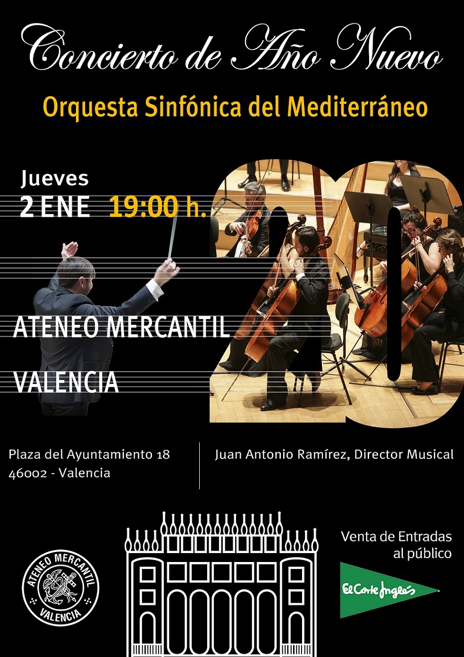 El Ateneo Mercantil de Valencia ha logrado que el tradicional Gran Concierto de Año Nuevo de Valencia llegue hasta nuestro Salón de Actos el próximo jueves 2 de enero a las 19 horas. El mejor concierto estas Navidades vendrá de nuevo al centro de Valencia, a la Plaza del Ayuntamiento. Un evento que contará con la prestigiosa Orquesta Sinfónica del Mediterráneo dirigida por Juan Antonio Ramírez que ofrecerá un concierto único con un repertorio innovador, en el que habrá baile clásico y varias sorpresas que iremos desvelando poco a poco.