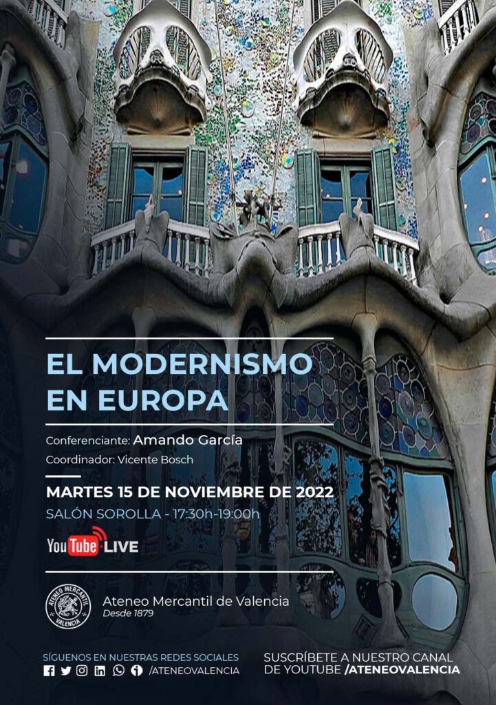 La conferencia será el próximo martes 15 de noviembre a las 17.30 horas en el Salón Sorolla del Ateneo Mercantil y llega bajo el título "El Modernismo en Europa". El ponente será Amando García, nuestro especialista en Historia del Arte.