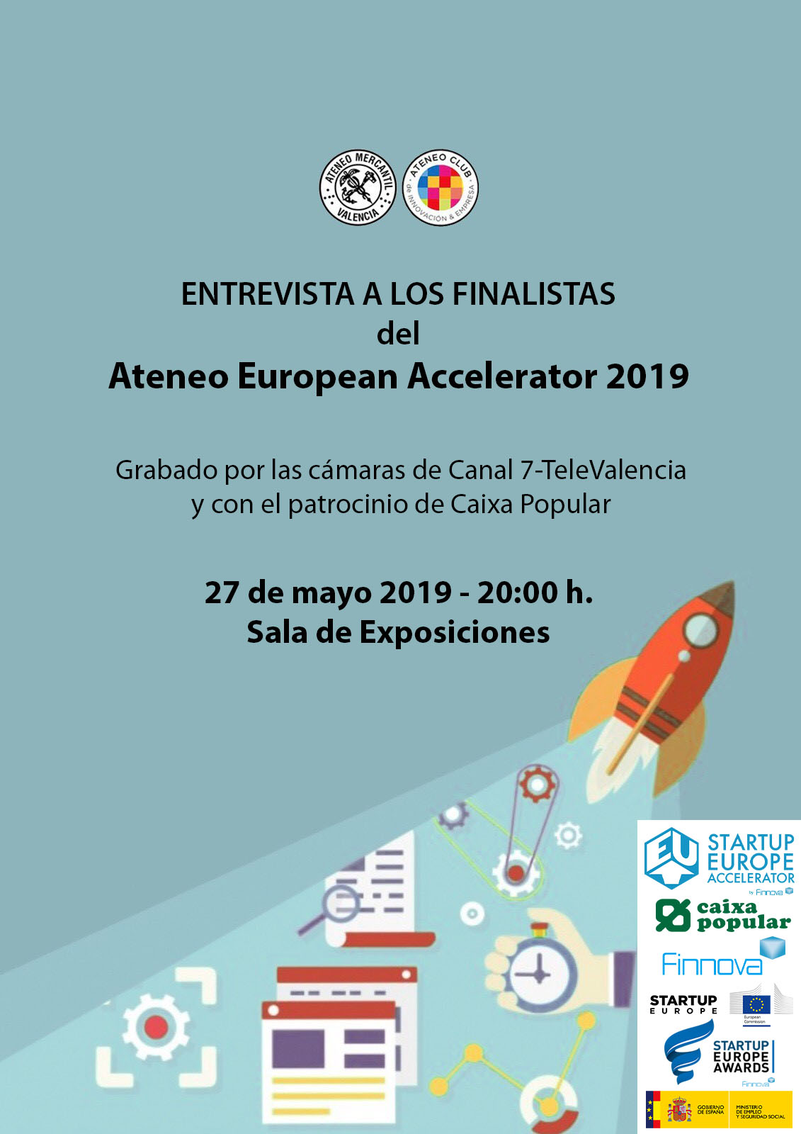 El próximo día 27 de mayo a las 20 horas en la Sala de Exposiciones, grabado por las cámaras de Canal 7-TeleValencia y con el patrocinio de Caixa Popular tendremos la oportunidad de conocer en profundidad de la mano de sus creadores los proyectos finalistas de la VI Edición del PREMIO ATENEO EUROPEAN ACCELERATOR 2019.