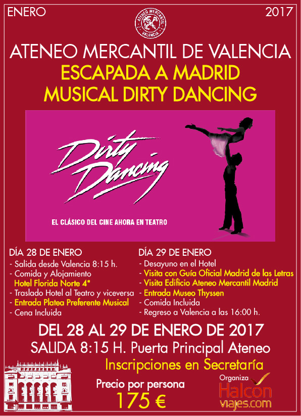 Por un gran precio, te alojarás en el Hotel Florida Norte de 4* en régimen de pensión completa y podrás disfrutar del Musical Dirty Dancing. Además el domingo se visitará con guía oficial el Madrid de las Letras y el edificio del Ateneo Mercantil de Madrid. Incluído también Entrada Museo Thyssen.