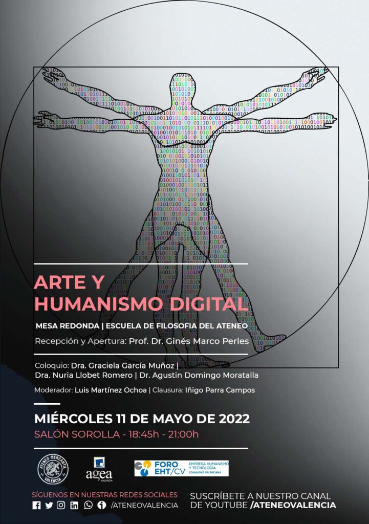 La Escuela de Filosofía del Ateneo Mercantil organiza junto al Grupo de Estudios de Actualidad, Agea Valencia, y el Foro Empresa, Humanismo y Tecnología de la Comunitat Valenciana, una jornada sobre antropología y la revolución digital el próximo miércoles 11 de mayo a las 19 horas en el Salón Sorolla del Ateneo Mercantil. En esta mesa redonda se tratarán aspectos antropológicos de la revolución digital. De manera especial se incidirá en el arte como expresión genuinamente humana, tanto en sus manifestaciones tangibles y físicas como en los entornos digitales. El acceso será libre se emitirá por streaming.