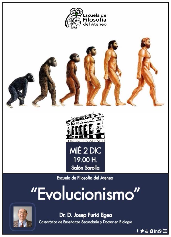 Así, el próximo miércoles 2 de diciembre a las 19 horas se impartirá la conferencia "Evolucionismo" que traerá el Prof. Dr. D. José Furió Egea, que es catedrático de Enseñanzas Medias y Doctor en Biología.