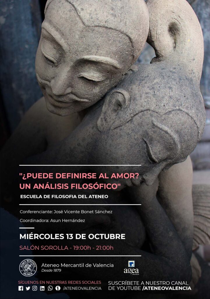 La Escuela de Filosofía del Ateneo regresa el próximo miércoles 13 de octubre a las 19 horas en el Salón Sorolla con la conferencia "¿Puede definirse al amor? Un análisis filosófico" que impartirá el Doctor en Filosofía y profesor de la Universidad Católica de Valencia y del Instituto de Investigación Edith Stein, José Vicente Bonet Sánchez. El acto lo presenta D. José Alfredo Pellicer de AGEA.