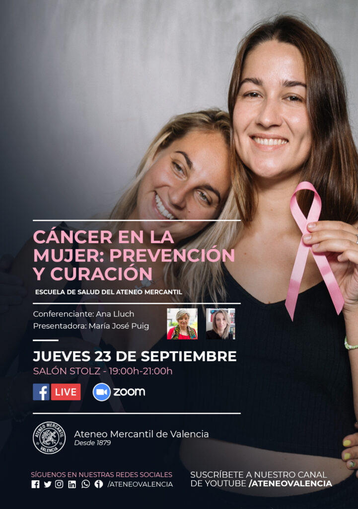 La Escuela de Salud del Ateneo Mercantil regresa a nuestra casa con una nueva conferencia el próximo jueves 23 de septiembre a las 19 horas en el Salón Stolz con la ponencia "Cáncer en la mujer: prevención y curación" y contará con la presencia de la Catedrática Emérita del área de Medicina de la Universitat de València y Coordinadora del Grupo de Investigación de Biología en Cáncer de Mama en INCLIVA, la Dra. Ana Lluch y con la presentación de también la Dra. María José Puig Núñez.