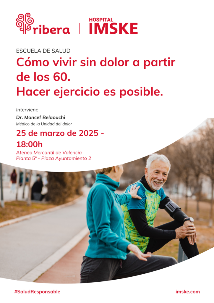 El Dr. Moncef Belaouchi, reconocido médico de la Unidad del Dolor del Hospital Ribera-IMSKE, compartirá estrategias y tratamientos innovadores para mejorar tu calidad de vida y mantenerte activo sin limitaciones. Descubre cómo el ejercicio puede ser una herramienta clave para vivir sin dolor, incluso después de los 60 años.