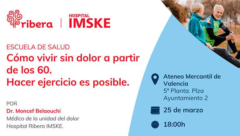 ¡No permitas que el dolor limite tus días! La Fundación del Ateneo Mercantil y la Fundación Ribera Hospital-IMSKE te invitan a la conferencia de la Escuela de Salud del Ateneo titulada "Cómo vivir sin dolor a partir de los 60. Hacer ejercicio es posible". Recuerda que sólo por asistir te invitamos a merendar chocolate y coca de llanda.