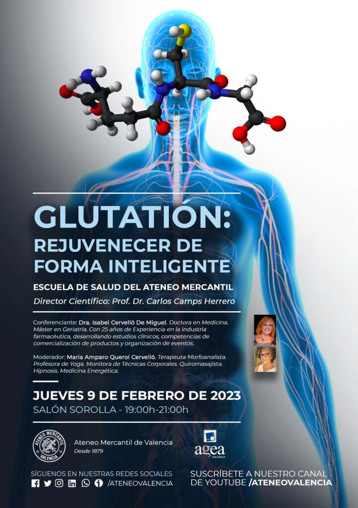 La Escuela de Salud del Ateneo en colaboración con Agea Valencia traen una nueva conferencia sobre el glutatión, un tripéptido que es un antioxidante natural y que está involucrado en diversos procesos, incluyendo la reparación de tejidos, la producción de proteínas, enzimas y hormonas y el funcionamiento del sistema inmunitario. Además, es clave para la desintoxicación.