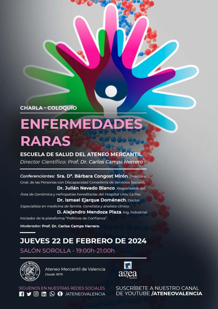 La Fundación del Ateneo Mercantil de la CV en colaboración con AGEA Valencia, Grupo de Estudios de Actualidad. Comunidad Valenciana, presentan un nuevo evento de la Escuela de Salud del Ateneo el próximo jueves 22 de febrero a las 19 horas en el Salón Sorolla (5º piso del Ateneo Mercantil). En esta ocasión se realizará una mesa redonda-coloquio sobre las "Enfermedades raras". Contaremos con un gran elenco de ponentes, especialistas en sus materias, que acercarán la problemática de las enfermedades raras desde varios puntos de vista, lo que nos ayudará a tener una visión global y contextualizará a las enfermedades poco frecuentes o raras.