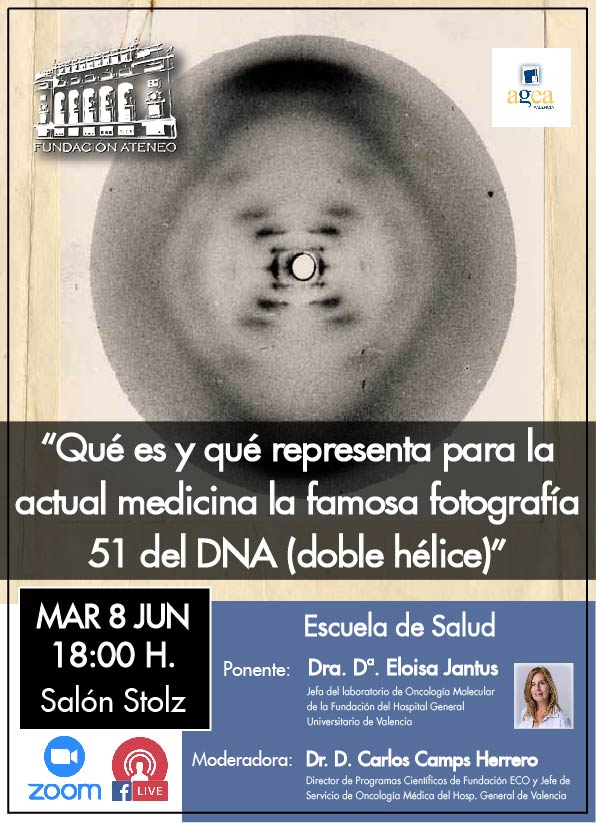 El próximo martes 8 de junio a las 18 horas regresal a nuestra institución la Escuela de Salud del Ateneo, que organiza la Fundación del Ateneo de la CV y AGEA Valencia, con una conferencia en la que se incidirá sobre las enfermedades oncológicas y la constitución genética. Así bajo el título: "Qué es y qué representa para la actual medicina la famosa fotografía 51 del DNA (doble hélice)", la jefa del laboratorio de Oncología Molecular de la Fundación del Hospital General Universitario de Valencia, la Dra. Dª. Eloisa Jantus Lewintre, nos ofrecerá su siempre interesante punto de vista tras las investigaciones y los grandes avances que se vienen realizando en los últimos años. Modera la conferencia, el también doctor, D. Carlos Camps Herrero, que es director de Programas Científicos de Fundación ECO y Jefe de Servicio de Oncología Médica del Hospital General de Valencia.