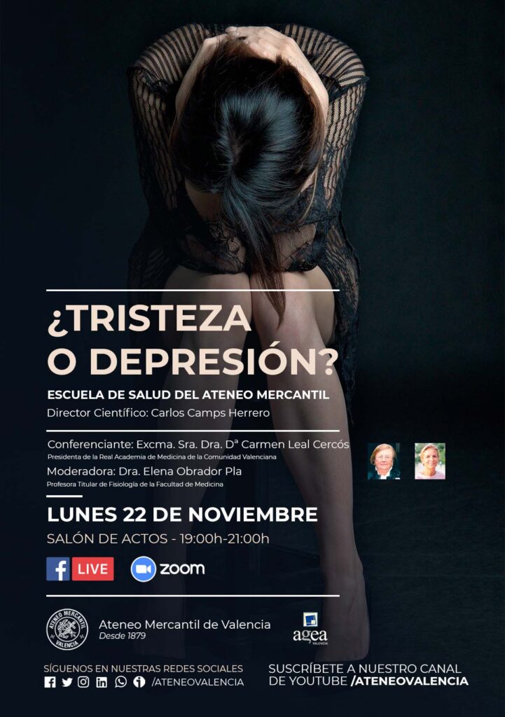 La Escuela de Salud del Ateneo Mercantil en regresa al Salón de Actos con una conferencia en la que se hablará largo y tendido sobre la depresión. El Ateneo Mercantil en colaboración con Agea Valencia han programado una conferencia el próximo lunes 22 de noviembre a las 19 horas, en la que contará con dos grandes profesionales médicos como son la Excma. Sra. Dª Carmen Leal Cercós y Dña. Elena Obrador Pla. Coordinará el acto el Director Científico de la Escuela de Salud, el Dr. Carlos Camps Herrero.