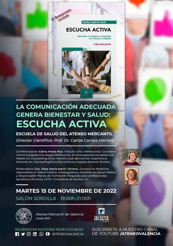 Regresa al Ateneo Mercantil de Valencia, la Escuela de Salud del Ateneo que organiza Agea Valencia con una conferencia sobre la escucha activa y que será impartida por Elena Ariste Mur. La conferencia llega bajo el título "La comunicación adecuada genera bienestar y salud: La Escucha Activa" y se impartirá el próximo martes 15 de noviembre a las 19 horas en el Salón Sorolla. Actuará de moderadora la Dra. Rosa María Marín Torrens.