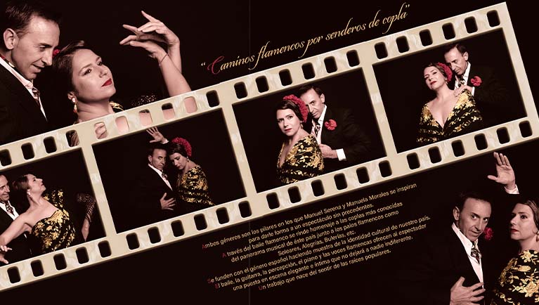 Ambos géneros son los pilares en los que Manuel Serena y Manuela Morales se inspiran para darle forma a un espectáculo sin precedentes. A través del baile flamenco se rinde homenaje a las coplas más conocidas del panorama musical de este país junto a los palos flamencos como Soleares, Alegrías, Bulerías, etc. Se funden con el género español haciendo muestra de la identidad cultural de nuestro país. El baile, la guitarra, la percusión, el saxofón y las voces flamencas ofrecen al espectador una puesta en escena elegante e íntima que no dejará a nadie indiferente.