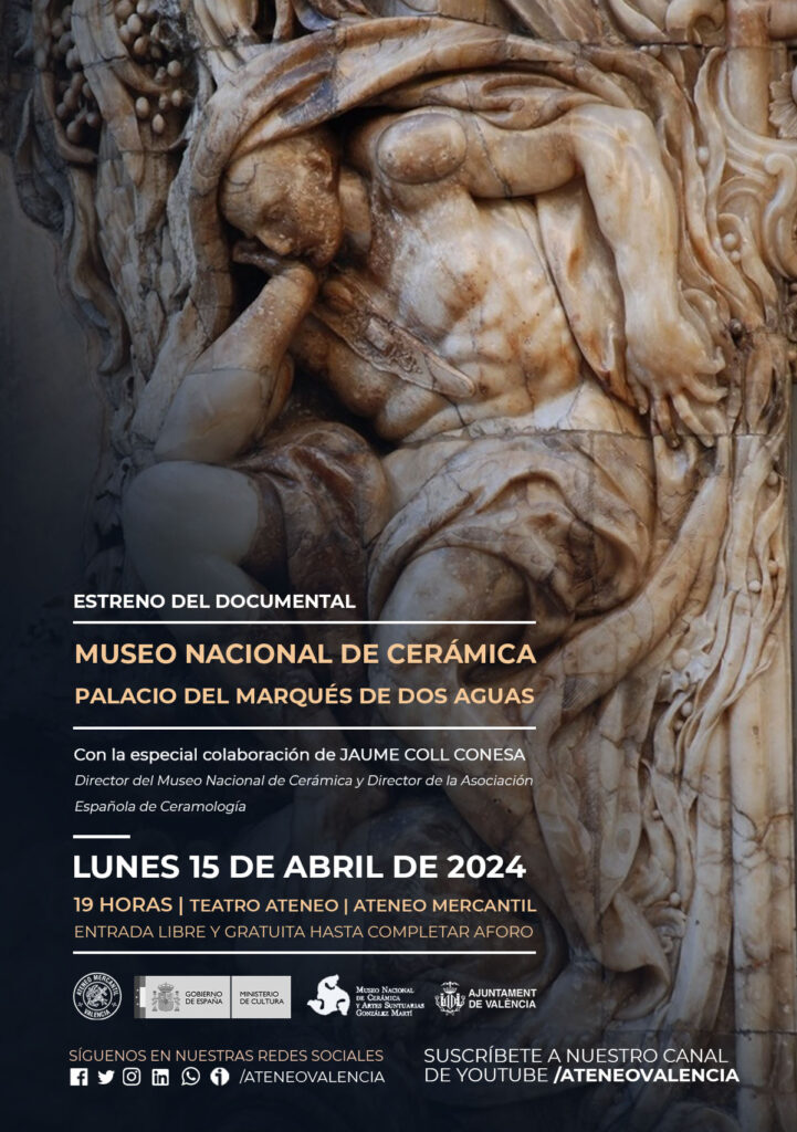 El Ateneo Mercantil de Valencia en colaboración con el Ministerio de Cultura estrena este lunes 15 de abril de 2024 a las 19 horas en el Teatro Ateneo la premier del documental del "Museo Nacional de Cerámica - Palacio del Marqués de Dos Aguas, una casona del siglo XV" que en breve se subirá a nuestro Canal de Youtube para el disfrute de todos nuestros suscriptores.