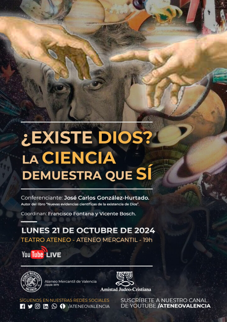 Su objetivo es demostrar que una mirada sin prejuicios al panorama de la ciencia moderna lleva necesariamente a la idea de Dios. Para ello nos presentará argumentos de peso apoyándose en abundante documentación y usando su estilo desenfadado. José Carlos González-Hurtado desmontará muchos mitos falsos sobre la imposibilidad de la existencia de Dios. Una conferencia que organiza el Ateneo Mercantil de Valencia y la Asociación Amistad Judeo-Cristiana.