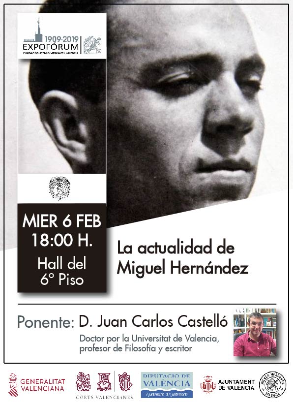 El Expoforum Valencia 2019 llenaraá este mes de febrero y durante los próximos tres meses de actos culturales a la ciudad de Valencia. Este miércoles 6 de febrero llega la tercera de las conferencias programadas en el Ateneo Mercantil de Valencia. Una programación cultural que traerá hasta nuestra ciudad eventos de toda índole y multidisciplinar. Así este miércoles a las 18:00 horas en el Vestíbulo de la Sexta Planta del Ateneo Mercantil se celebrará una conferencia bajo el título "La actualidad de Miguel Hernández" y la dará el ponente D. Juan Carlos Castelló, Doctor por la Universitat de Valencia, profesor de filosofía y escritor.