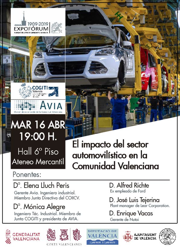 Nueva conferencia de Expoforum Valencia en el Ateneo Mercantil de Valencia. Así el próximo martes 16 de abril a las 19 horas llega al Hall del Sexto Piso la ponencia "El impacto del sector automovilístico en la Comunidad Valenciana” que impartirán cinco especialistas en la materia como son Dª. Elena Lluch, Dª. Monica Alegre, el ex empleado de Ford D. Alfred Richte, el Plant Manager de Lear Corporation D. José Luis Tejerina y el gerente de Nutai D. Enrique Vacas.