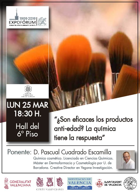 Tras el parón por la Fallas, el Expoforum regresa con fuerza al Ateneo Mercantil de Valencia con una conferencia que está organizada por el Colegio de Químicos de Valencia. Así este lunes 25 de marzo a las 18.30 horas en el Hall del Sexto Piso del Ateneo llega una conferencia bajo el título: "¿Es eficaz la cosmética anti-edad? La Química tiene la respuesta" y el ponente es el químico cosmético, D. Pascual Cuadrado Escamilla.