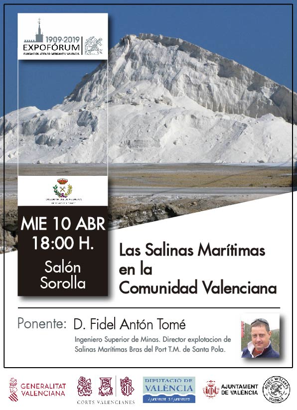 El Expoforum Valencia 2019 ha preparado una nueva conferencia en el Ateneo Mercantil de Valencia que organiza el Colegio Oficial de Ingenieros de Minas de Levante el próximo miércoles 11 de abril a las 18 horas en la Salón Sorolla de nuestra entidad. La conferencia llega con el título: "Las Salinas Marítimas en la Comunidad Valenciana" y que impartirá D. Fidel Antón Tomé, Ingeniero Superior de Minas. Director explotacion de Salinas Marítimas Bras del Port T.M. de Santa Pola.