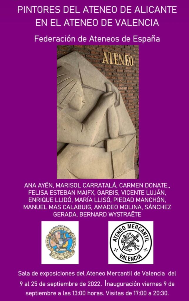 Los pintores del Ateneo de Alicante mostrarán su trabajo en la Sala de Exposiciones del Ateneo Mercantil de Valencia del 9 al 25 de septiembre de 2022 gracias a la Federación de Ateneos de España, que es la organizadora de esta muestra. La visita se podrá realizar todos los días de 17 a 20.30 horas, de manera gratuita. La inauguración será este viernes 9 de septiembre a las 13 horas.