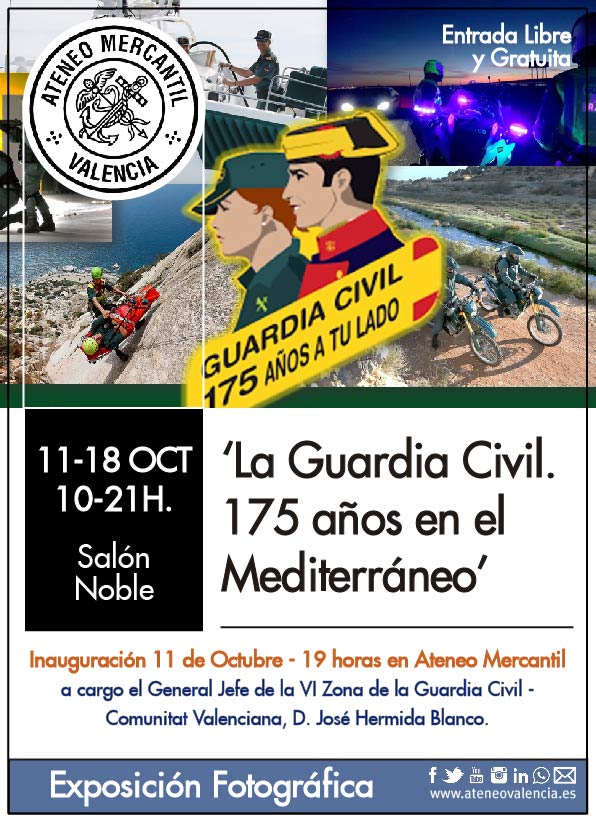 La Guardia Civil conmemora este año sus 175 años de existencia, desde su fundación el 13 de mayo de 1844, y para celebrarlo se va a realizar una gran exposición fotográfica de gran formato en el Salón Noble del Ateneo Mercantil desde el viernes 11 al 18 de Octubre. Una veintena de instantáneas de la cámara del fotorreportero Manuel Lorenzo que ofrece una visión actual, moderna y cercana de la Guardia Civil, que reflejan a la perfección los valores que caracterizan al cuerpo: sacrificio, honor y espíritu de servicio de la sociedad.