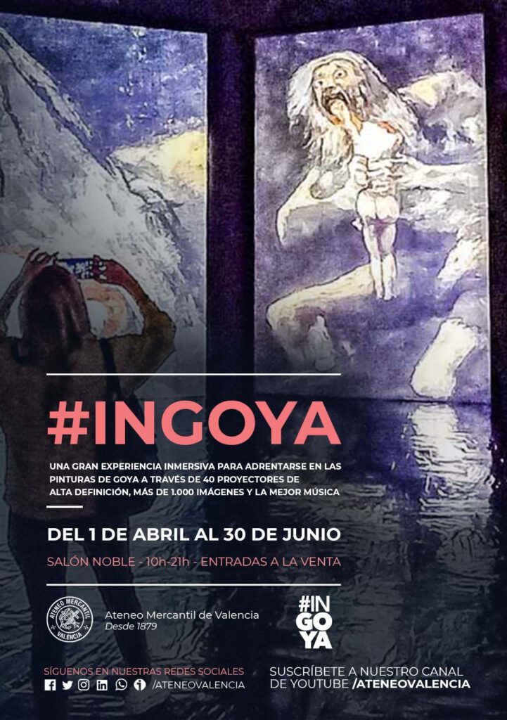 ¡Qué no te lo cuenten y emociónate al sentir de cerca la obra de Goya! Del 1 de abril hasta el 30 de junio llega INGOYA al Ateneo Mercantil de Valencia. Una experiencia inmersiva que gira en torno a la obra del pintor aragonés, y que ha tenido un gran éxito en las dos ciudades que ha visitado hasta el momento: Granada y Madrid. Más de 70.000 personas han disfrutado ya de esta producción, cuidada al detalle y que utiliza tecnologías punteras. Sin duda, una experiencia audiovisual inmersiva única para disfrutar de la obra del maestro aragonés.Más de mil imágenes que envuelven al público gracias a cuarenta proyectores de última generación que, sincronizados con música de compositores clásicos como Albéniz, Falla, Granados o Boccherini, crean una perfecta alianza entre arte y tecnología para acercar al público de todas las edades el talento del genial pintor.