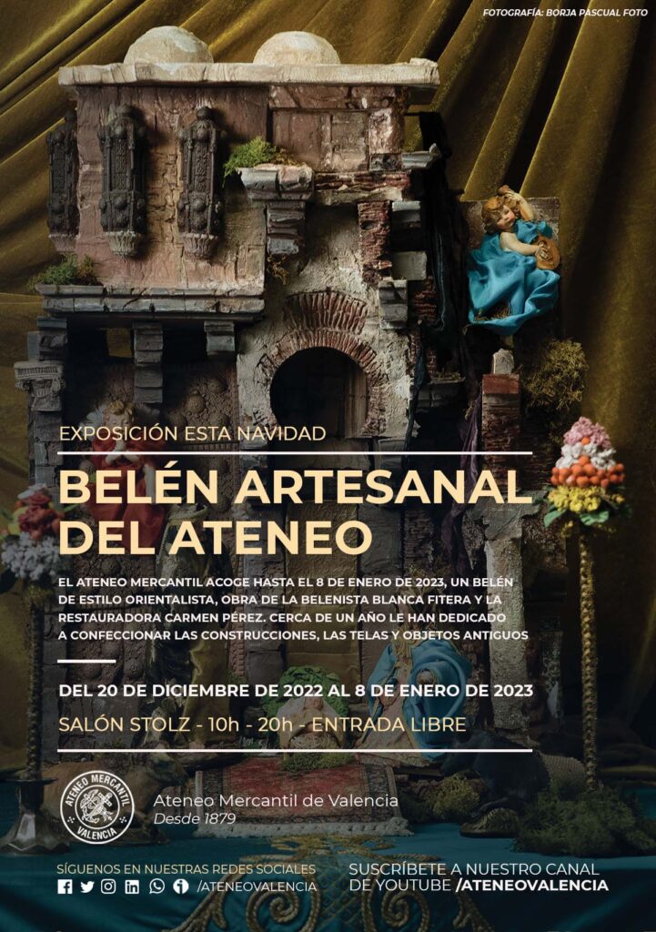 Estas Navidades, coincidiendo con el reconocimiento de la representación cristiana del Belén como Patrimonio Inmaterial de la Humanidad, el Ateneo Mercantil expone, en el Salón Stolz, uno propio de características muy particulares. El proyecto, realizado a lo largo de un año por la restauradora Carmen Pérez y la belenista Blanca Fitera, se ha materializado en un belén de estética orientalista donde coexisten las construcciones de Blanca Fitera y las figuras de Carmen Pérez en total armonía.