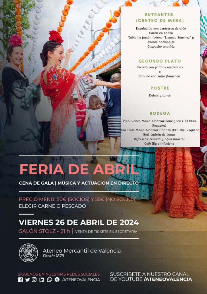 No te pierdas la cena-espectáculo de la "Feria de Abril" que hemos organizado en el Ateneo Mercantil el próximo viernes 26 de abril de 2024 a las 21 horas en el Salón Stolz de nuestra entidad. Un año más el arte y la tradición andaluza se dan cita en Valencia y lo harán en el salón más elegante y emblemático de nuestra casa.