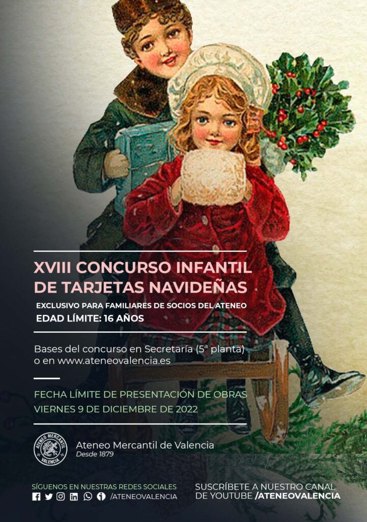 El Ateneo Mercantil de Valencia ha convocado el XVIII Concurso Infantil de Tarjetas Navideñas y para ello se hacen públicas las bases de un certamen que tiene siempre una gran acogida entre los más pequeños de la familia ateneísta. Ya se pueden presentar los dibujos en Secretaría (quinto piso) hasta el próximo viernes 9 de diciembre, fecha en la que se cerrará el plazo de recepción de tarjetas de esta edición del concurso. Recuerden que pueden participar los niños y niñas familiares de nuestros socios y la edad límite son los 16 años. Con motivo de las fiestas de Navidad nuestra institución vuelve a pensar en los más pequeños y por eso organiza de nuevo el tradicional concurso de dibujo en el que se aúnan dos temas básicos que se deben plasmar: la Navidad y el Ateneo Mercantil de Valencia.