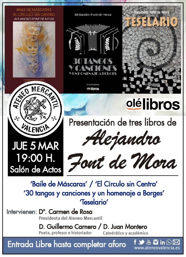 El Ateneo Mercantil de Valencia acogerá el próximo jueves, 5 de marzo, a las 19 horas la presentación de los tres libros que recopilan cuatro poemarios escritos por Alejandro Font de Mora y que llevan por título "Baile de máscaras"/ "El círculo sin centro", "Teselario" y "Treinta tangos y un homenaje a Borges".