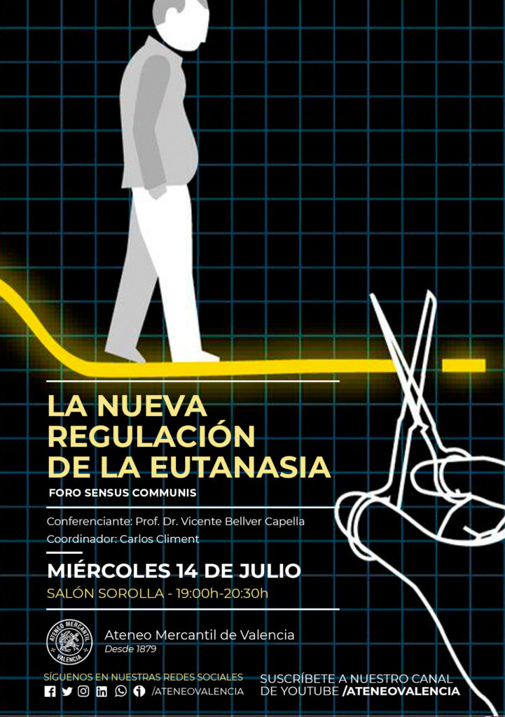El Foro Sensus Communis se despide con una conferencia el próximo miércoles 14 de julio a las 19 horas en el Salón Sorolla en la que se abordará un tema de actualidad y que ha levantado cierta polémica entre varios sectores de la población como es el de la Eutanasia. Bajo el título "La nueva regulación de la Eutanasia", el foro contará con la presencia del Prof. Dr. Vicente Bellver Capella, que es catedrático de Filosofía del Derecho y Filosofía Política y Director del Departamento de Filosofía del Derecho y de la Política de la Universitat de València. Una ponencia que tan sólo podrá seguirse de manera presencial.