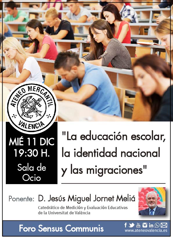 La próxima reunión del Foro Sensus Communis será el próximo miércoles 11 de diciembre a las 19.30 horas en la Sala de Ocio y llega bajo el título "La educación escolar, la identidad nacional y las migraciones" que traerá como invitado a un especialista en la materia como es el catedrático de Medición y Evaluación Educativas de la Universitat de València, D. Jesús Jornet Meliá. Una conferencia y un posterior debate abierto en el que se tratará de pensar sobre el valor social de la educación como apuesta por la ciudadanía intercultural. La realidad ante una ciudadanía intercultural conlleva múltiples implicaciones socio-educativas que pueden estar construyéndose ya sea desde el propio centro escolar o desde el ámbito familiar e incluso social.