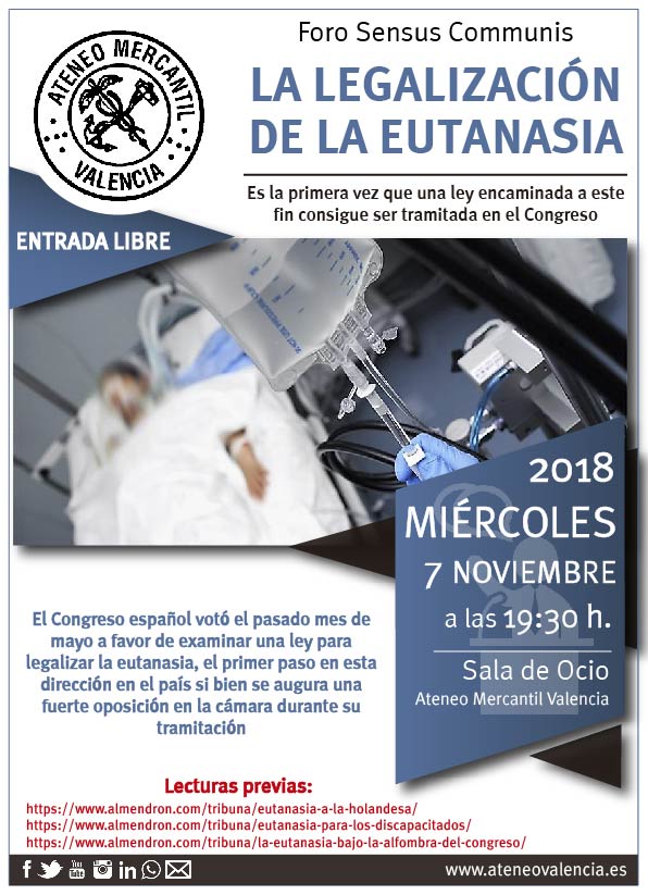 Nueva reunión del Foro Sensus Communis para debatir de manera abierta y razonada sobre los asuntos de actualidad que generan polémica o que tienen opiniones enfrentadas en la sociedad cilvil española. Tras la anterior cita con la maternidad subrogada, ahora llega el momento de hablar de la legalización de la eutanasia. El debate será el miércoles 7 de noviembre, de nuevo en la Sala de Ocio, a las 19.30 horas.