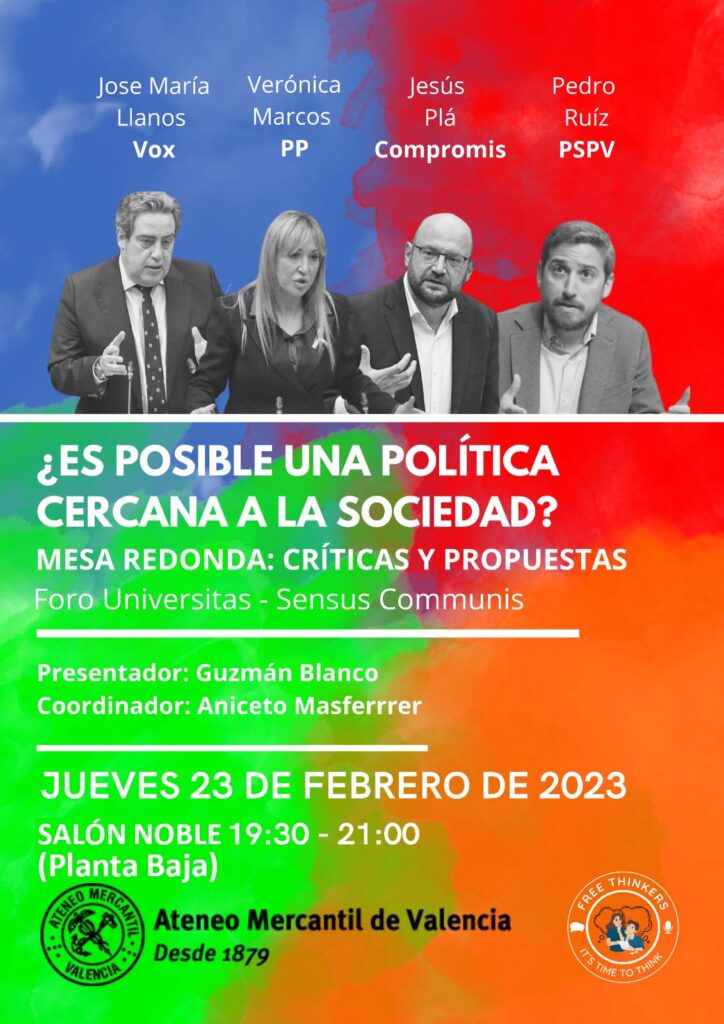 El próximo jueves 23 de febrero a las 19.30 horas en el salón noble de la planta baja del Ateneo Mercantil de Valencia se celebra un nuevo encuentro del Foro Sensus Communis con motivo de un aniversario histórico para la democracia española y dada su proximidad con las elecciones valencianas, desde FreeThinkers organiza una mesa redonda con representantes de las cuatro fuerzas políticas más representativas en el plano autonómico.