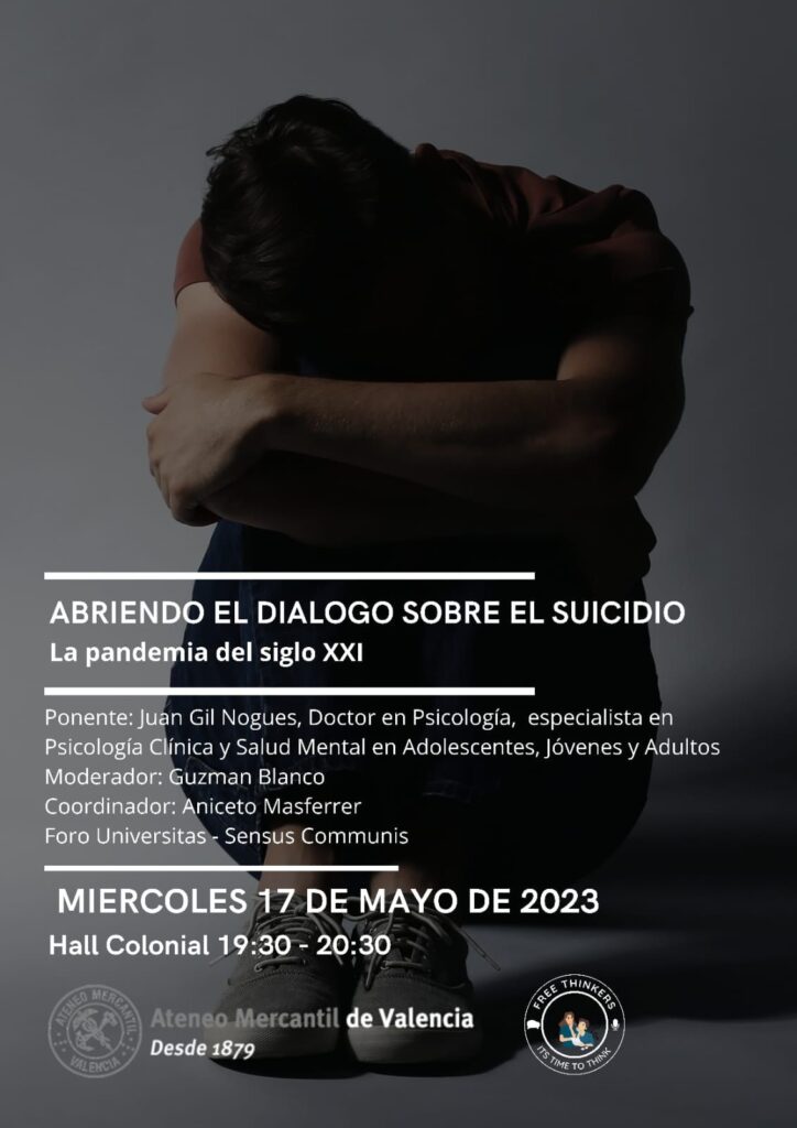 Regresa al Ateneo Mercantil de Valencia el Foro Universitas - Sensus Communis, impulsado por Free Thinkers, para ofrecernos una interesante sesión informativa en la que se tratará un tema de enorme relevancia entre los más jóvenes como es el del suicidio, un tema tan de actualidad como delicado. Será de la mano de Juan Gil Nogués, un psicólogo con amplia formación y experiencia: dos décadas tratando problemas emocionales, de ansiedad, depresión etc.