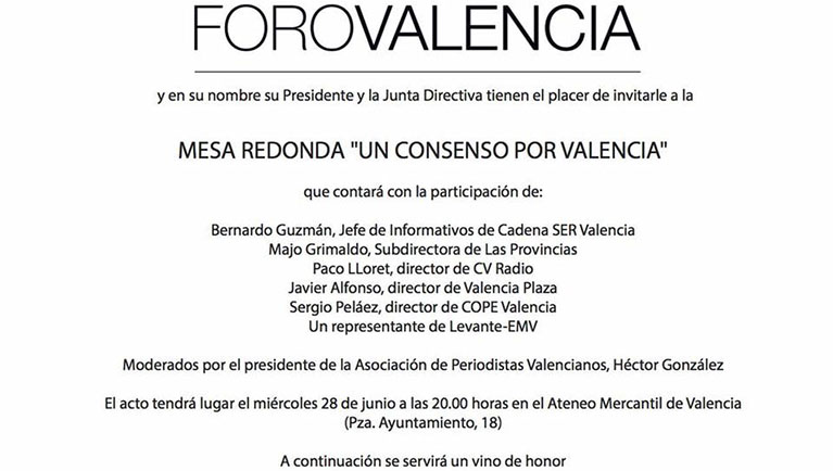 Foro Valencia tiene el placer de invitarle el próximo miércoles 28 de junio en Ateneo Mercantil de Valencia a una Mesa Redonda bajo el título "Un Consenso por Valencia" en la que participarán varios de los periodistas referentes de la cuidad: Bernardo Guzmán, jefe de informativos de Radio Valencia Cadena Ser; Majo Grimaldo, subdirectora de Las Provincias; Paco Lloret, director de CVRadio; Javier Alfonso, director de Valencia Plaza; Sergio Peláez, director de la Cadena COPE Valencia y un representante del Levante-EMV. El debate estará moderado por Héctor González, presidente de la Asociación de Periodistas Valencianos.