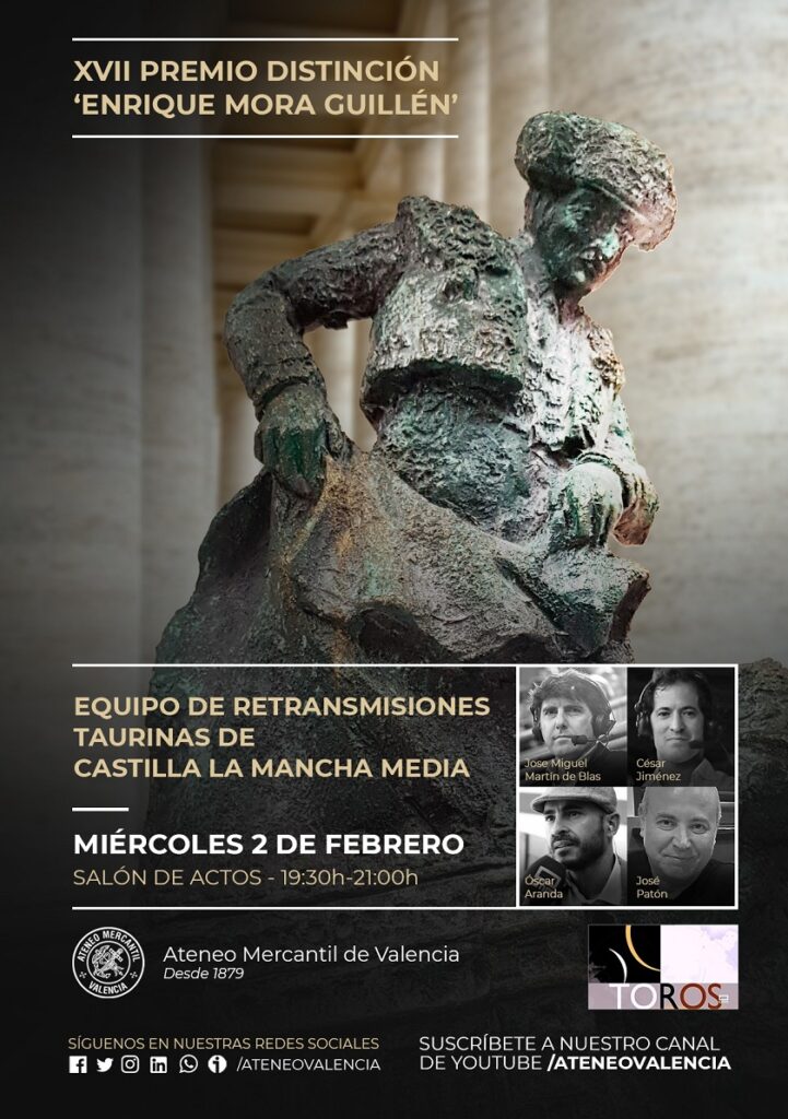El próximo miércoles 2 de febrero a las 19.30 horas en el Salón de Actos del Ateneo Mercantil de Valencia se llevará a cabo la gala de entrega del XVII Premio Distinción 'Enrique Mora Guillén' 2021 al equipo de retransmisiones taurinas de Castilla La Mancha Media. Un equipo que estará representado en este acto por José Miguel Martín de Blas (director), César Jiménez (torero), José García Patón (realizador) y Óscar Aranda (inalámbrico). En el acto intervendrán la presidenta del Ateneo Mercantil, Carmen de Rosa, el directivo del Ateneo Mercantil, Enrique Mora Rubio y el portavoz de la Tertulia Taurina del Ateneo, Francisco Roger.