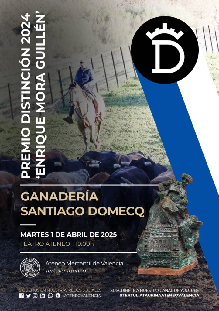 El Ateneo Mercantil de Valencia tiene el honor de acoger e invitarle, el próximo 1 de abril, a la solemne ceremonia de entrega del Premio Distinción Enrique Mora Guillén 2024, un galardón que en esta edición ha recaído en la prestigiosa ganadería de Santiago Domecq.