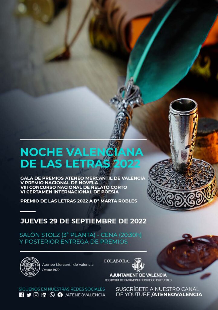 El Ateneo Mercantil continua con la firme apuesta por la cultura y, en especial, de las letras, con la consolidación de sus garladones literarios donde se premia a los amantes de las letras. En esta V Noche Valenciana de las Letras sigue la linea ascendente de obras presentadas y, sobre todo, la calidad de los escritos. El jurado de los concursos literarios está compuesto por escritores, editores y críticos literarios y se reunió a principios del mes de septiembre para seleccionar las obras ganadoras entre los finalistas.