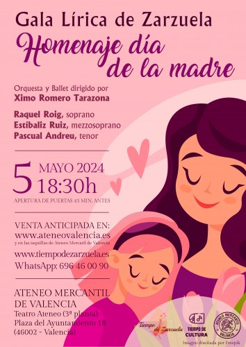 La Compañía valenciana Tiempo de Zarzuela con su director Ximo Romero, presenta el 5 de Mayo a las 18.30 h. en el Ateneo Mercantil de Valencia, la Gala Lírica de Zarzuela, Homenaje en el día de la Madre.
