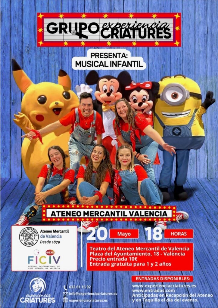 El Ateneo Mercantil de Valencia en colaboración con el Festival Internacional de Cine Infantil de Valencia (FICIV) han programado una tarde muy divertida para la tarde del sábado 20 de mayo a las 18 horas en el Teatro del Ateneo con la presentación de un gran Musical Infantil que trae al Grupo Experiencia Criatures hasta nuestra ciudad. Una tarde en la que habrá Canciones infantiles, baile y las mascotas que animarán a nuestros pequeños para que pasen una tarde muy divertida.