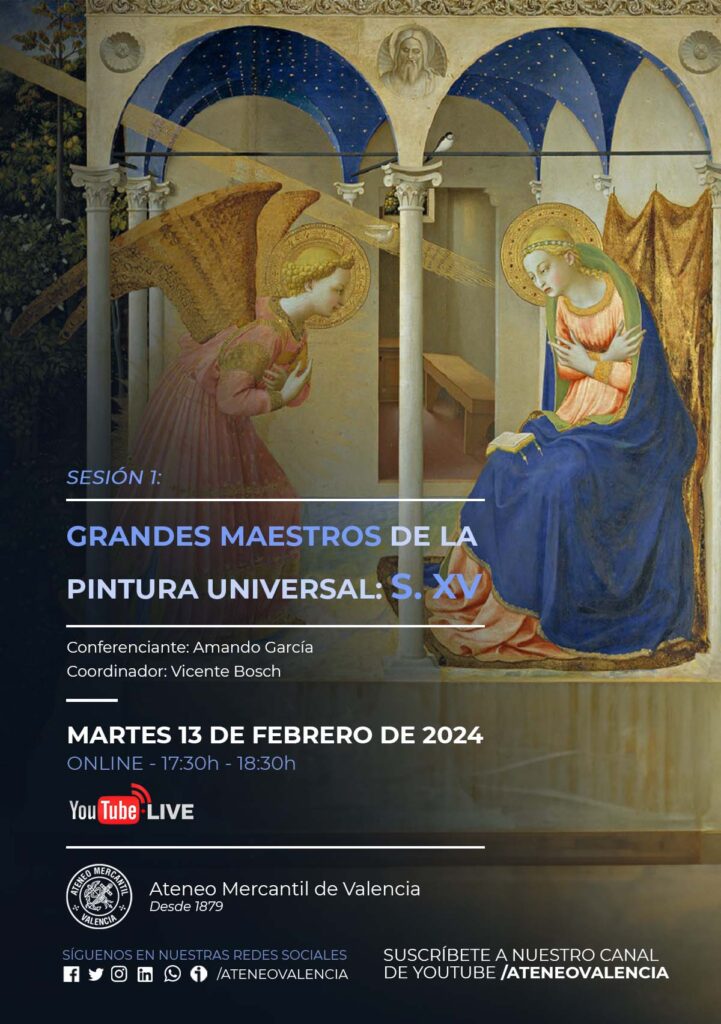 El Ateneo Mercantil de Valencia prosigue con sus conferencias sobre arte y en esta ocasión se pone en marcha un ciclo sobre los grandes maestros de la Pintura Universal. En esta primera sesión nos centraremos en el siglo XV. De nuevo D. Amando García nos ilustrará desgranando los mejores pintores de la historia y lo hará con su magnífica forma de entender el arte.