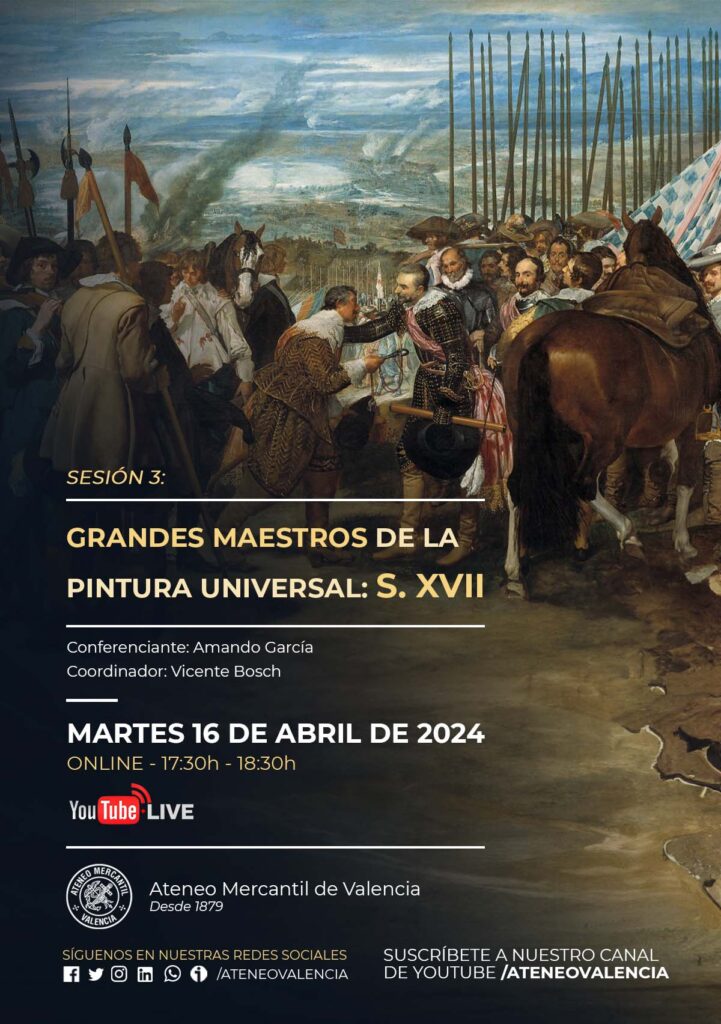 El Ateneo Mercantil de Valencia prosigue con sus conferencias sobre arte y en esta ocasión se pone en marcha un ciclo sobre los grandes maestros de la Pintura Universal. En esta tercera sesión nos centraremos en el siglo XVII. De nuevo D. Amando García nos ilustrará desgranando los mejores pintores de la historia y lo hará con su magnífica forma de entender el arte.