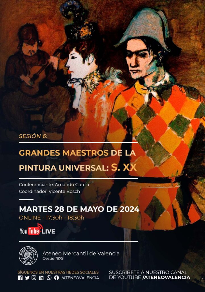 El Ateneo Mercantil de Valencia prosigue con sus conferencias sobre arte y en esta ocasión se pone en marcha un ciclo sobre los grandes maestros de la Pintura Universal. En esta sexta sesión nos centraremos en el siglo XX. De nuevo D. Amando García nos ilustrará desgranando los mejores pintores de la historia y lo hará con su magnífica forma de entender el arte.