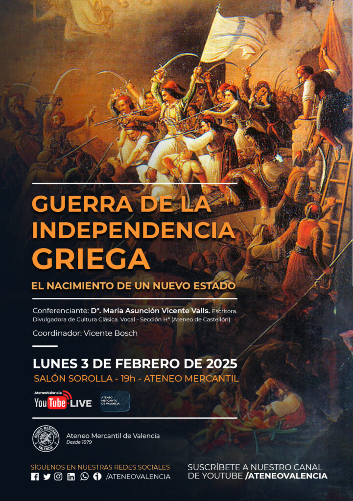 El Ateneo Mercantil tiene el placer de invitarles a una apasionante conferencia a cargo de la reconocida experta en historia contemporánea, Dª. María Asunción Vicente Valls, quien nos llevará a descubrir uno de los episodios más fascinantes y cruentos de la historia moderna: la Guerra de la Independencia Griega y el nacimiento de un nuevo estado-nación.