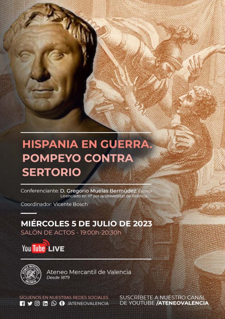 La conferencia se centrará en la Guerra Civil que enfrentó, entre 75-72 a. C., a Cneo Pompeyo el Grande contra el general rebelde Quinto Sertorio en la península ibérica, sobre todo en tierras levantinas, con la destrucción de Valentia, la batalla de Saguntum...